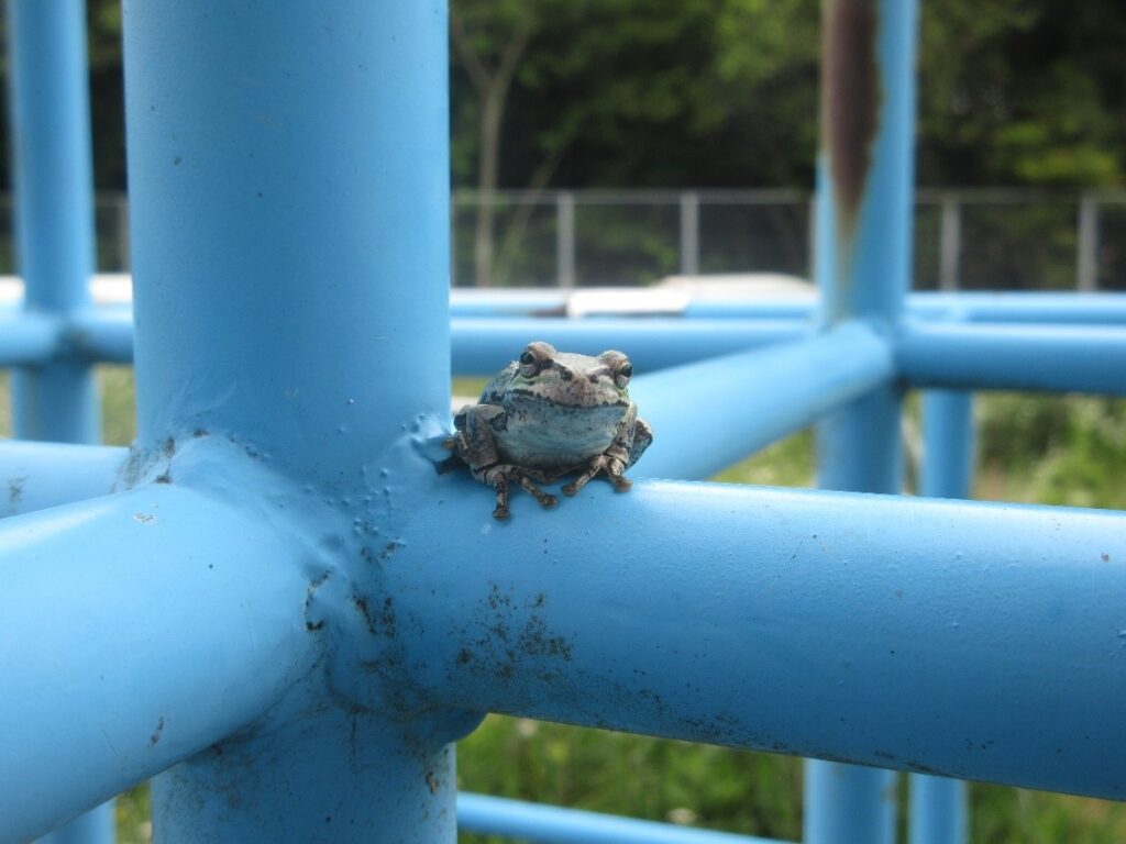 この日もジャングルジムで休んでいるカエルを職員と一緒に眺めていました。