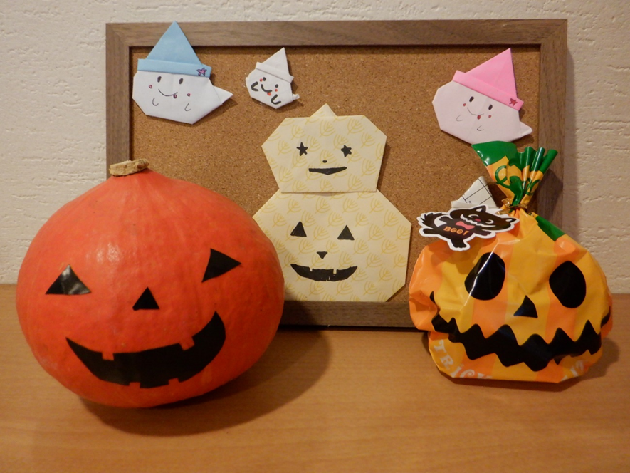 かぼちゃにシールを貼り表情を作っているのですが、時々微妙に顔が変わっていることも…かわいいオバケのいたずらでしょうか。