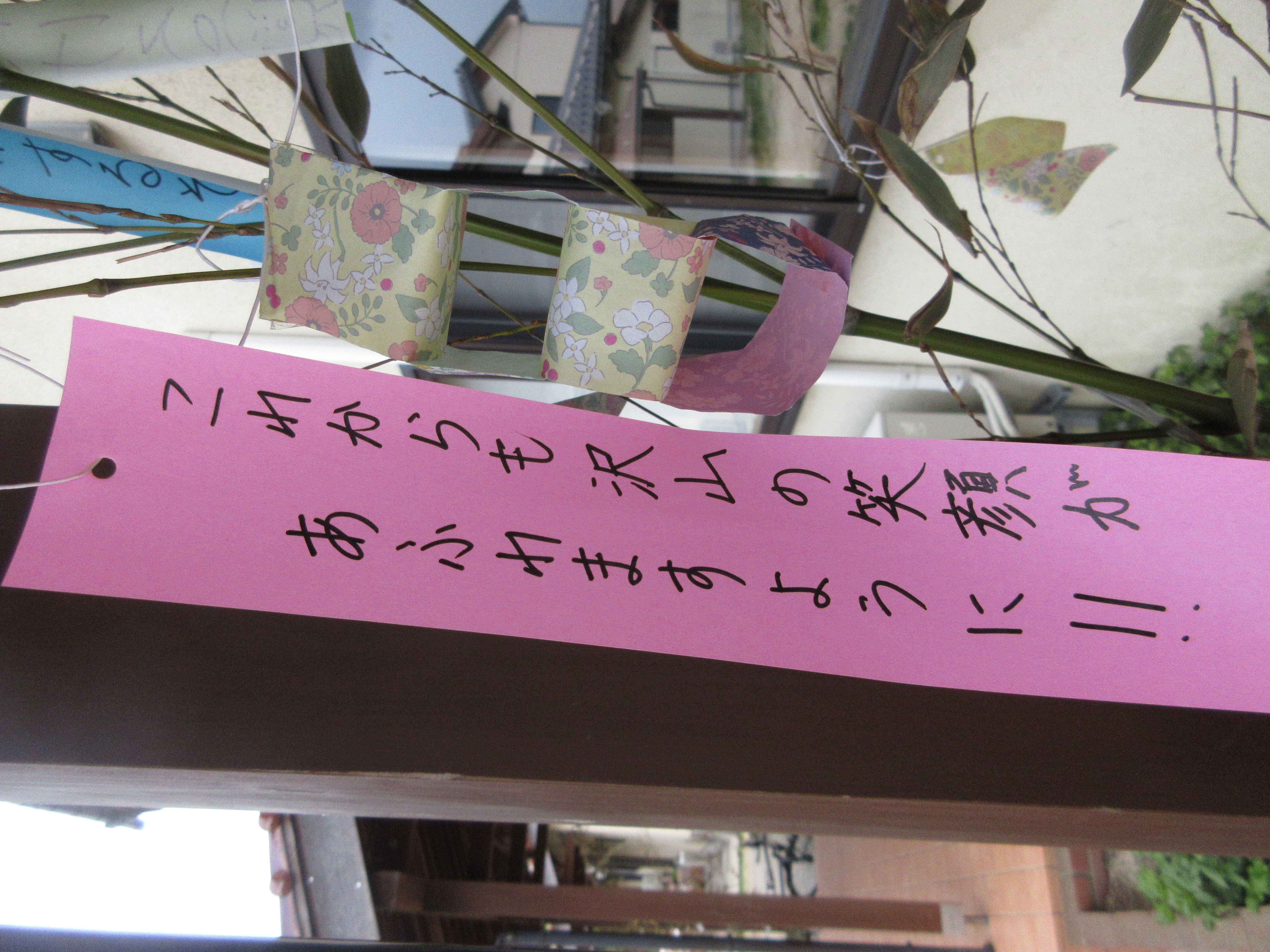 7月7日 投稿日時: 2023年7月13日 投稿者: koutoku 7月7日、短冊飾りを各ホームの玄関で飾りました!! どのホームもオリジナリティー溢れるものとなりました。 皆のお願いが叶いますように(^-^)/ 皆さんは短冊にお願いを書きましたか?